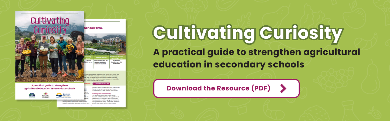 Cultivating Curiosity BackgroundThis resource profiles school-based agriculture programs across B.C., outlining how they were developed, implemented, and sustained. It also offers inquiry-based ideas and activity suggestions for integrating agriculture across subject areas and throughout the seasons. Educators will find links to dual-credit and post-secondary options, along with best practices for aligning classroom learning with weekly and seasonal farm cycles.